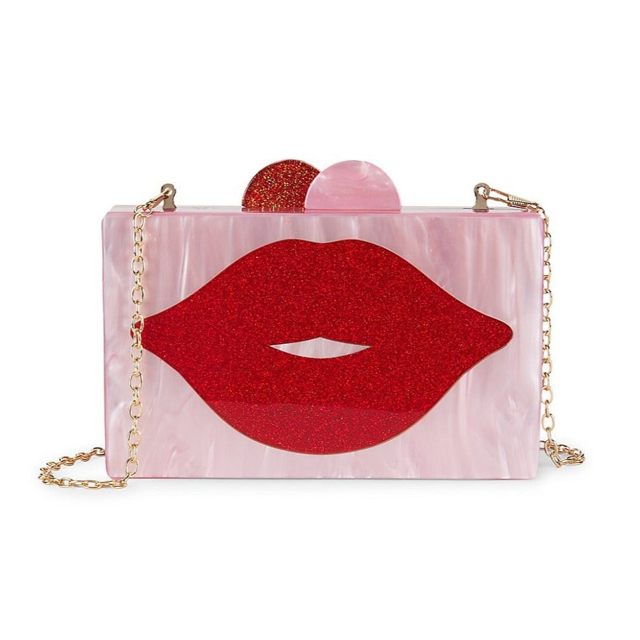 A rectangular-shaped acrylic clutch is adorned with red lips in a glitter motif on the front.