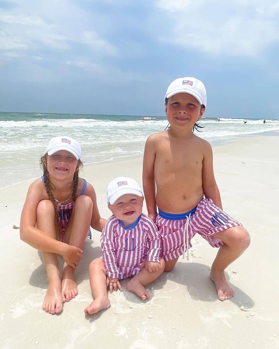 What’s red, white, and blue, and oh-so-cute? Meet the USA Baseball Hat! Each white soft cotton twill hat is embroidered with an American flag in front, classically crafted to make shielding from the summer sunshine simple, stylish, polished, and patriotic. Pairs with the Bits & Bows USA Bow Baseball Hat as a sibling set. * Soft-structured 6-panel baseball hat * Tuck strap with metal slide closure
