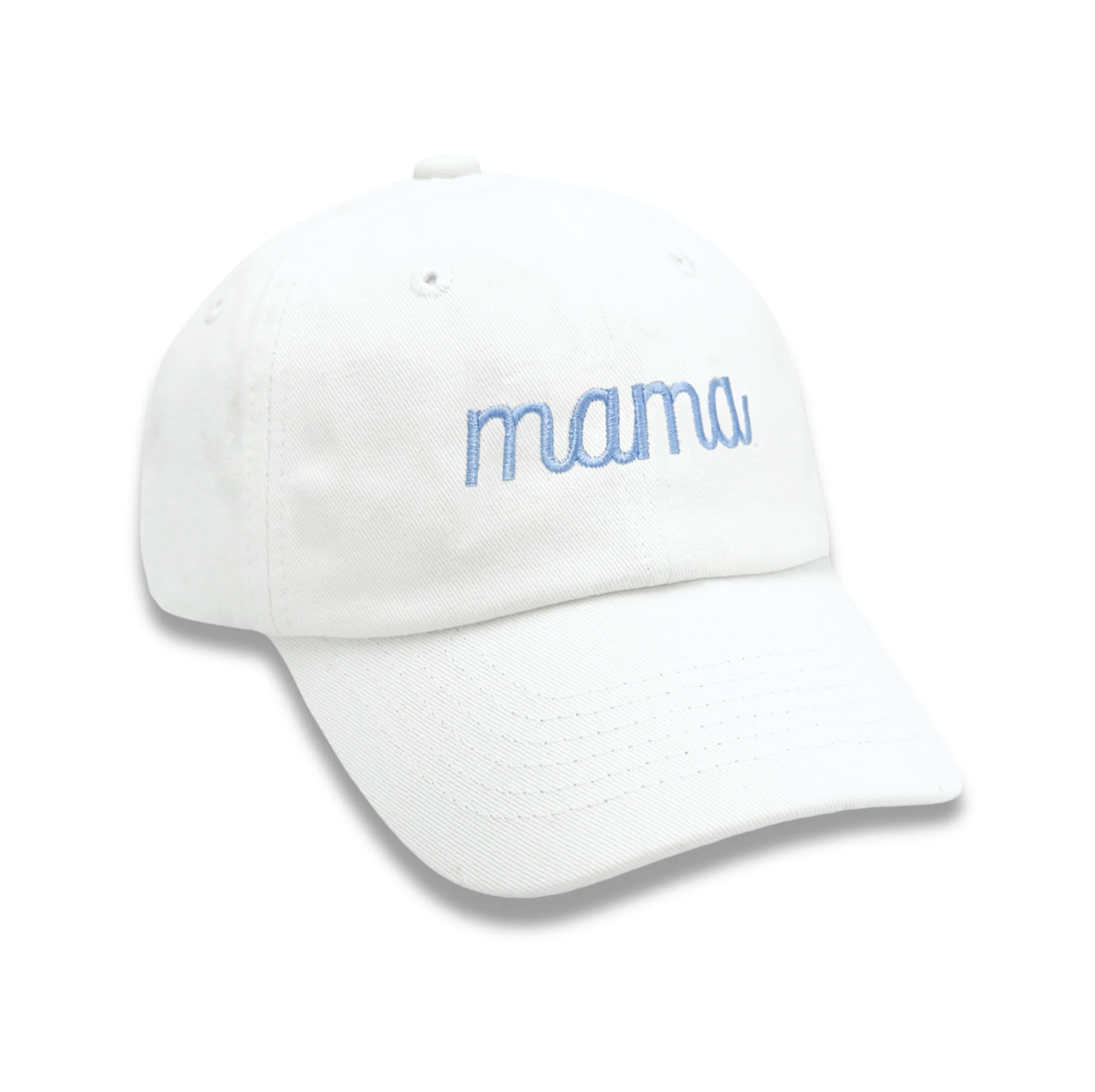 White baseball hat with "mama" embroidery.