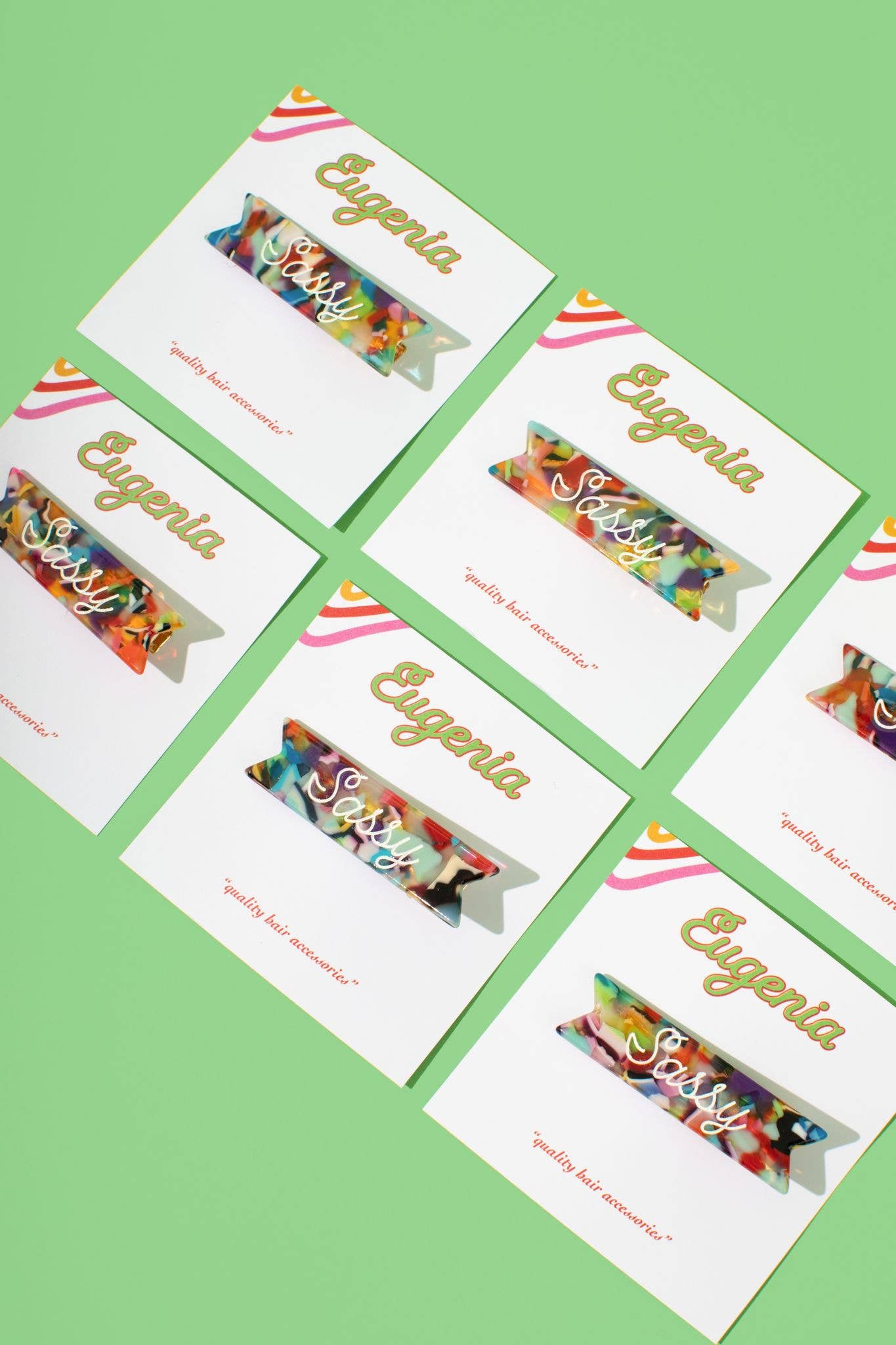 'Sassy' : Rainbow Confetti cellulose acetate with white cursive ink inlay and a gold alligator clip on the back.