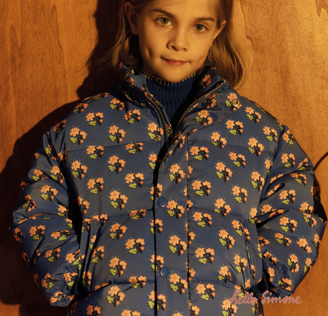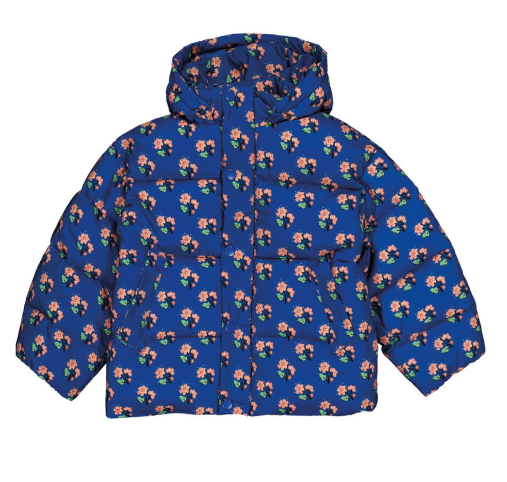 Description: All-over printed nylon down jacket. Short, slightly oversized fit, rounded back sleeve. Removable hood with snaps. Closure with metal zipper and snaps on center placket.