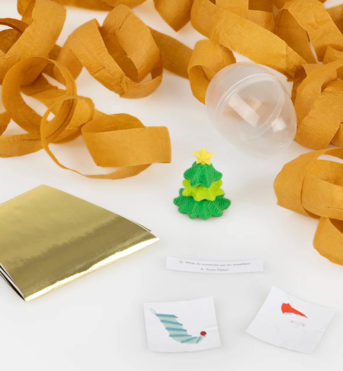 - Each surprise ball contains a gold foil paper party hat, 2 stickers, a joke and a Christmas tree eraser