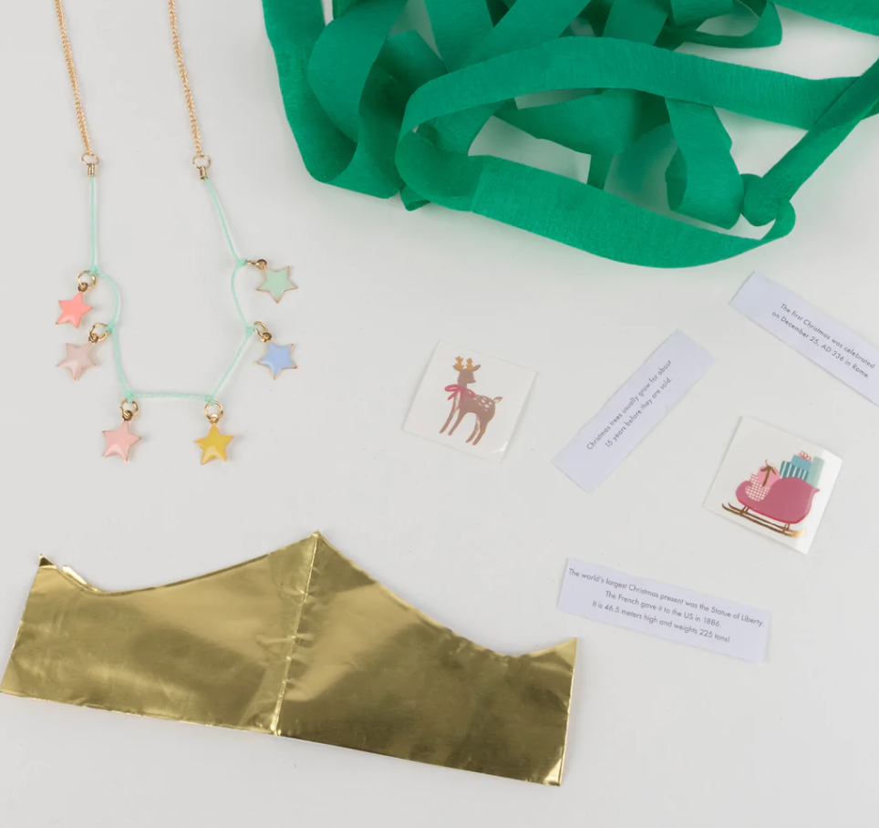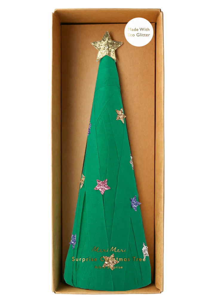 - Imagine the look on a child's face when they unwrap this fabulous crepe paper covered Christmas tree cone that's filled with gifts! Peel off the layers to reveal a gold foil paper hat, stickers, temporary tattoos and trivia. Then, inside shredded paper, discover an envelope containing a stunning enamel star necklace.
