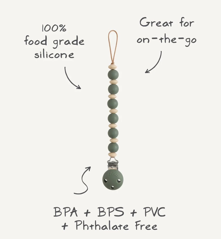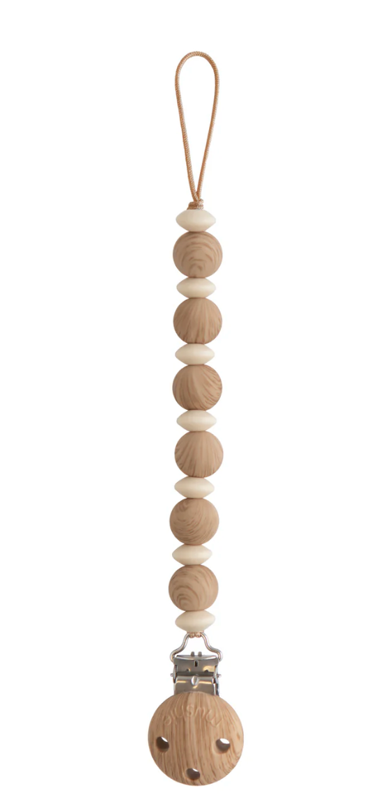 The Mushie silicone pacifier clip offers durability, function and simplicity to families on-the-go. Made from 100% food-grade silicone, our clip features a silicone clasp that brings a modern take to a traditional favorite. With two sizes of beads stacked in a simple pattern, the Luna clip is sure to become a favorite accessory for parents and littles alike. The clip is easy to clean and helps keep soothing items in reach for little ones.