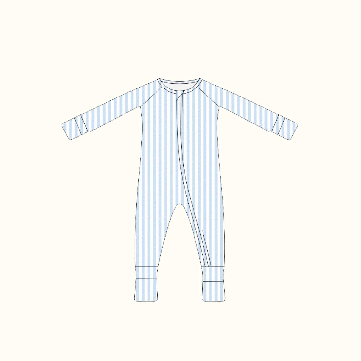 Blue Moon Bamboo Baby Sleeper - Sweet Summer Vibes All Year Long For the mama who loves a little classic charm—this one’s for you. Our Polished Prints bamboo sleeper features a timeless vertical blue stripe that feels fresh, clean, and oh-so-sweet on your little one. Whether you’re bringing baby home or grabbing a cozy gift, this sleeper is one you’ll keep reaching for. The details: * Bamboo Bliss: 95% bamboo, 5% spandex * 3AM Diaper Change Champion: Double zipper closure because figuring out complicated closures when you're half-asleep should not be a thing * Fold-over hand and foot covers so you can skip the eternal hunt for matching accessories * Actually True-to-Size