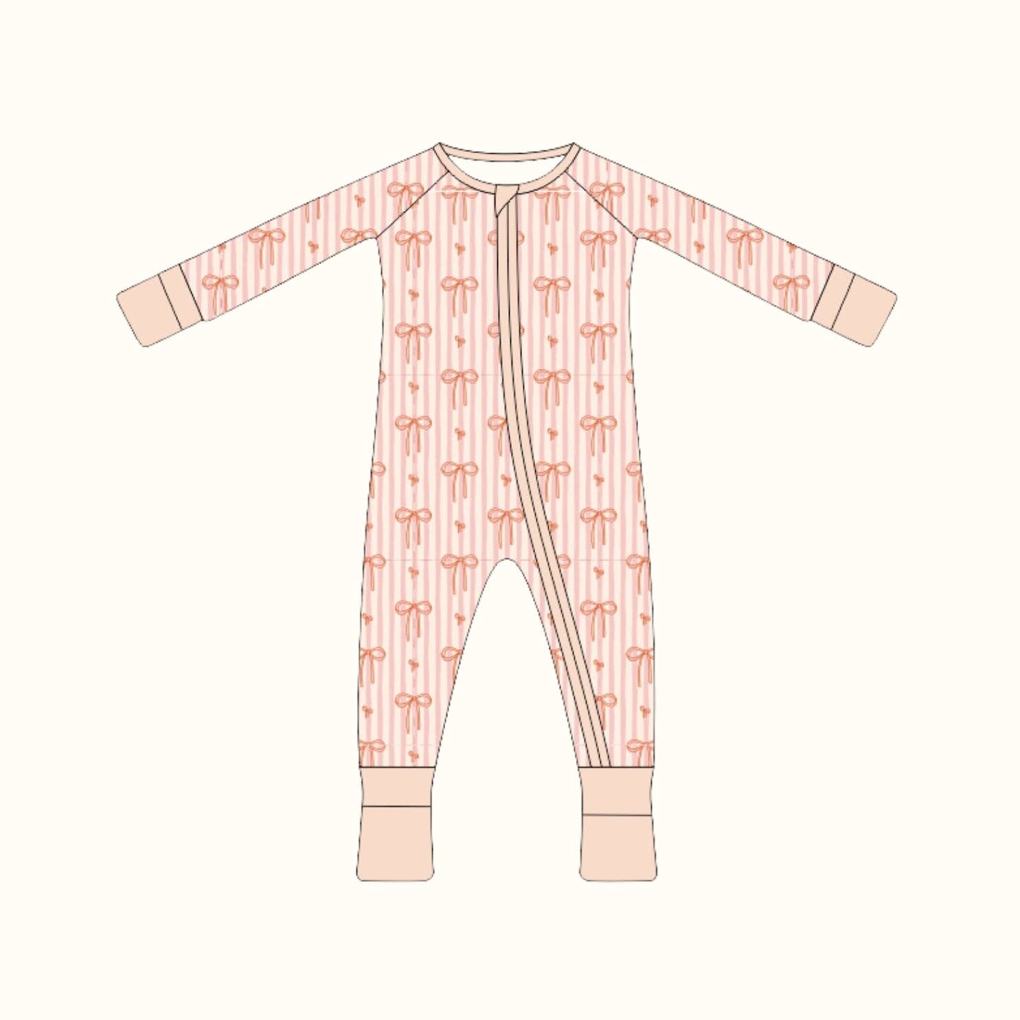 Pink Bow Stripe Bamboo Baby Sleeper - Sweet Dreams with a Side of Sass Listen, if you're going to do pink, you might as well do it RIGHT. This sleeper is giving major "sweet but make it stylish" vibes with those adorable little bows scattered across soft pink stripes. It's like if a Parisian baby boutique had a baby with your favorite cozy pajamas - absolutely precious but not over-the-top. The details: * Bamboo Bliss: 95% bamboo, 5% spandex * 3AM Diaper Change Champion: Double zipper closure because figuring out complicated closures when you're half-asleep should not be a thing * Fold-over hand and foot covers so you can skip the eternal hunt for matching accessories * Actually True-to-Size