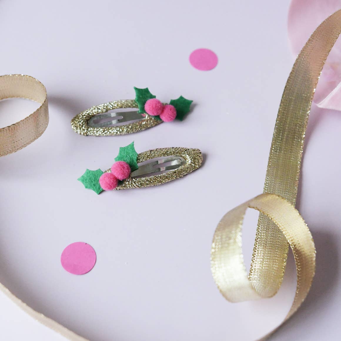Have a holly jolly Christmas with our gorgeous Pom Pom holly clips! Each with a bright pom pom bobble, green leaves and both set onto gold ribbon snap clips.