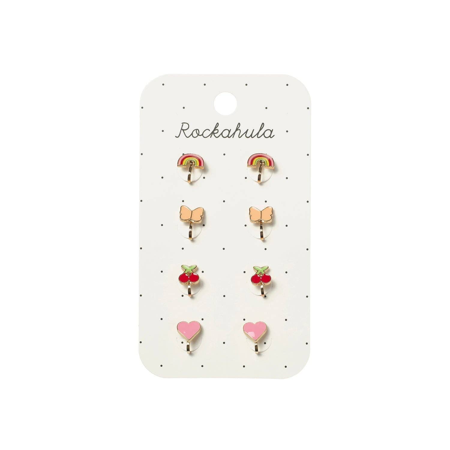 Sprinkle a little carnival magic with this set of clip on earrings. This fun four pack features rainbows, butterflies, cherries and love hearts - all sat on metal gold clips. Each piece clips on gently (no pierced ears needed) and have been designed with little ears in mind!
