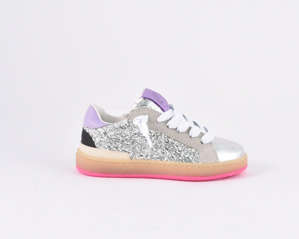 Authentic leather shoe with silver metallic, pink rubber sole and purple detail.