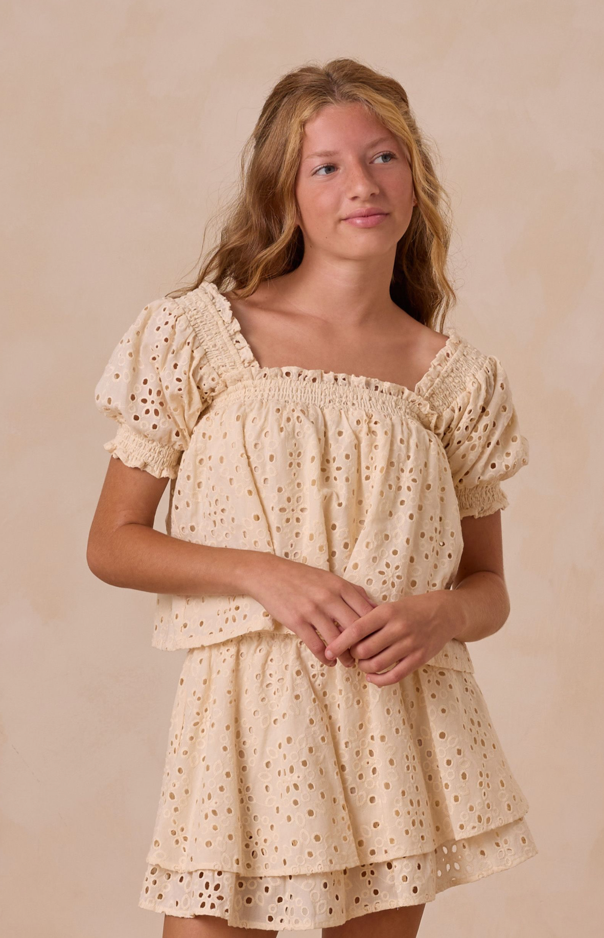 Our Rose Mini Skirt is a sure summer staple. This beautiful eyelet style comes with a double tiered skirt and a gathered waistline.