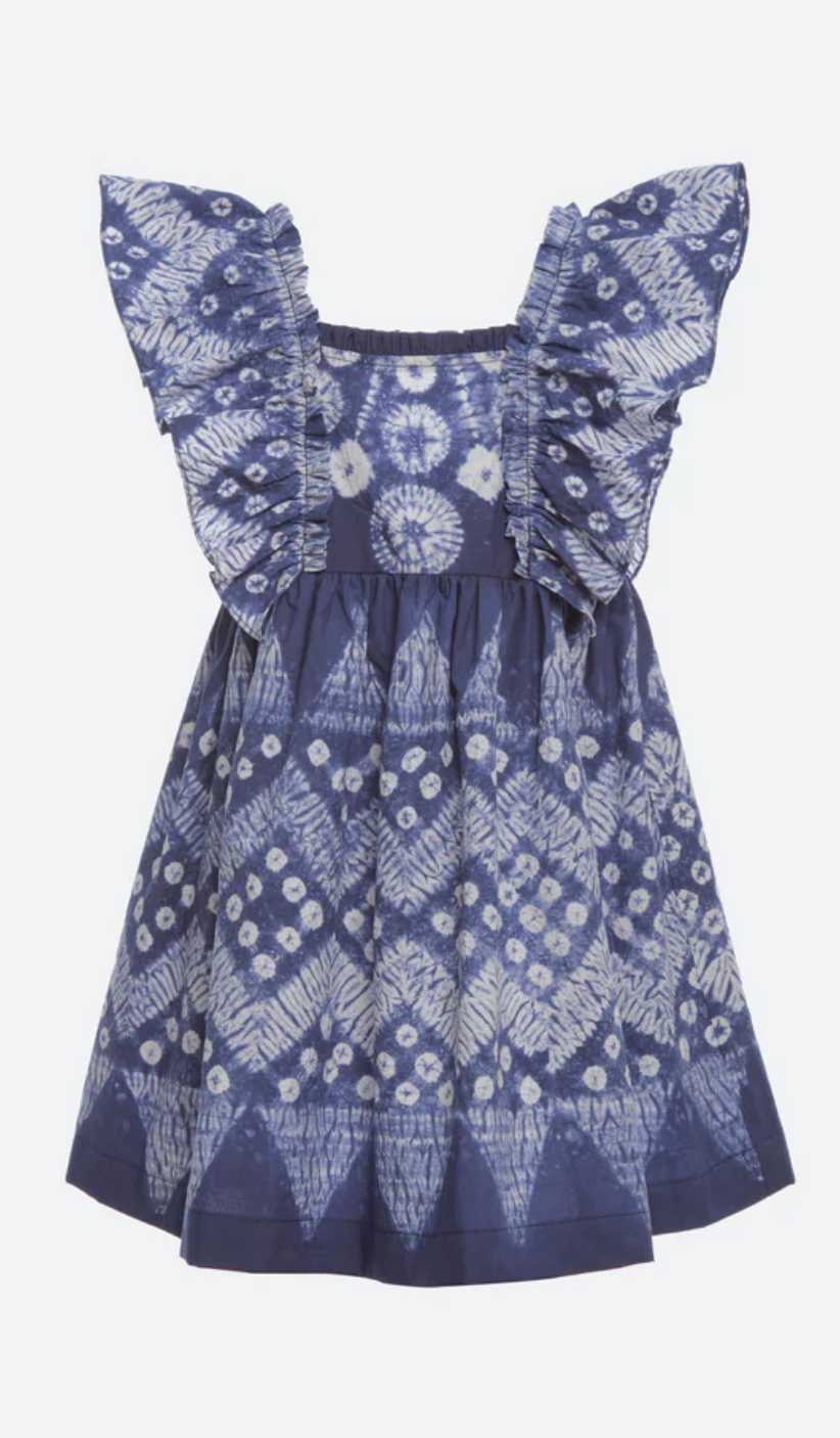 The Yana tie dye print kids dress features flutter sleeves, square neckline and ruffle detailing. Part of our mommy & me coordinating collection.