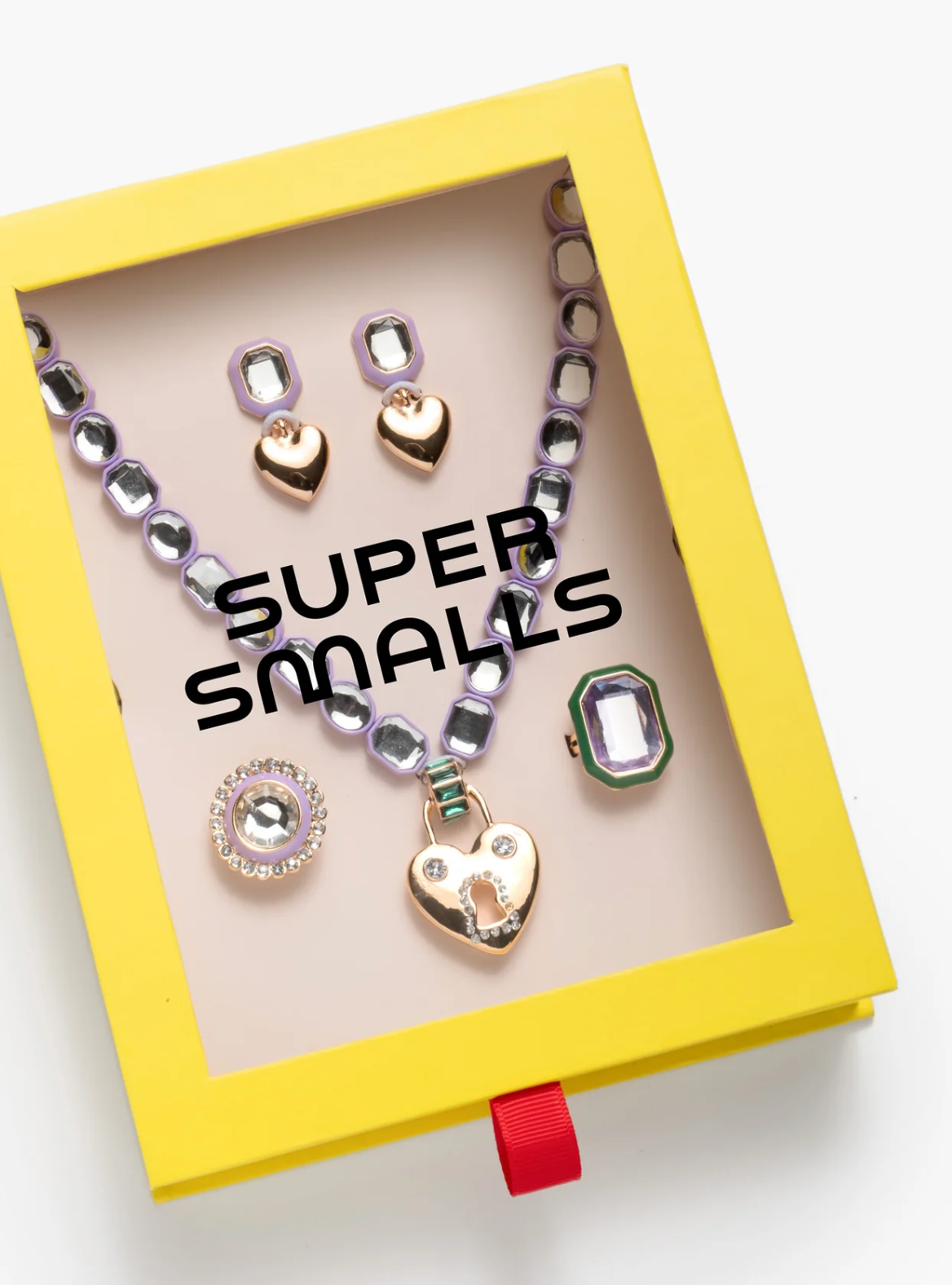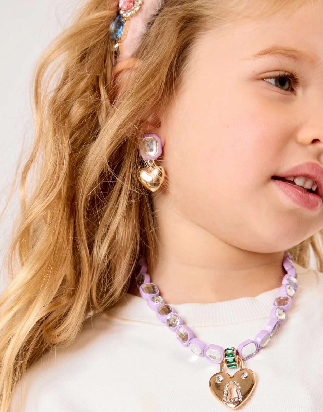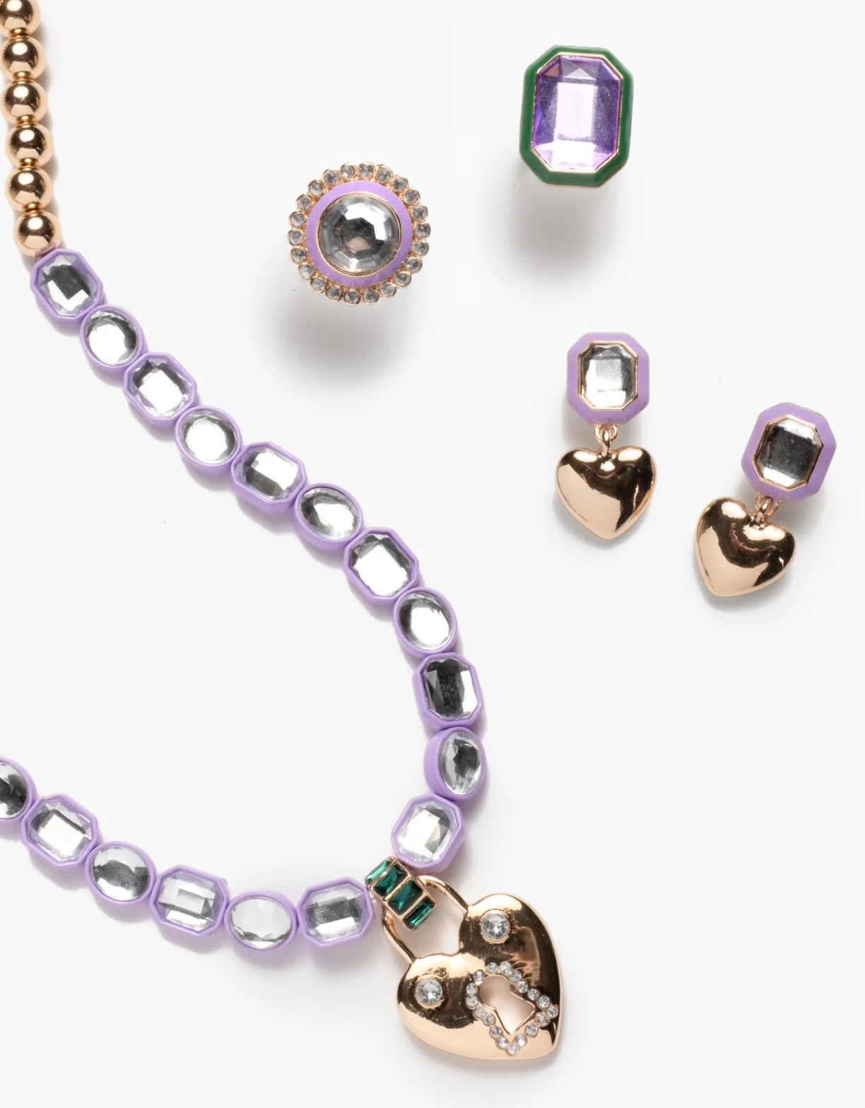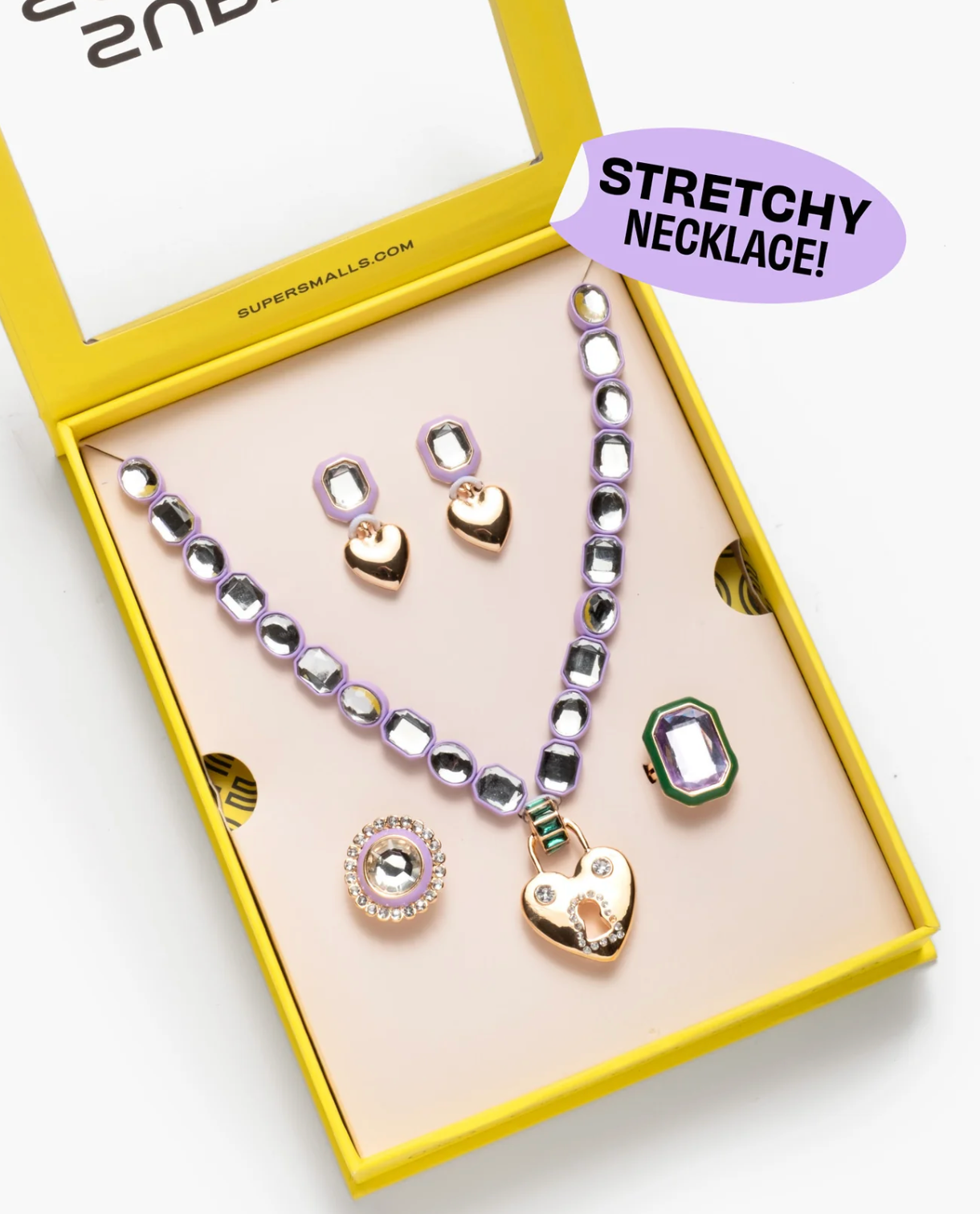 The Lavender Haze Mega Set is a purple lover’s dream, bringing sparkle, style, and a whole lot of fun to your jewelry collection. Featuring a super stretchy gem-studded necklace with a golden heart lock pendant, clip-on earrings with twinkling gems and heart charms, and two adjustable rings for endless styling fun, this set has everything you need to shine. Perfect for dress-up, playtime, or adding a little extra magic to any outfit!