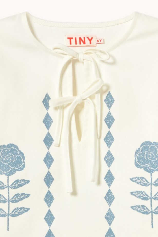 This short dress in soft light twill fabric with an off-white base features a charming Flower Pattern on the front, blending sweetness and style in a fresh, versatile design. The short puff sleeves with elastic add a romantic touch, while the round neckline with front opening and tie straps creates an adorable, adjustable detail. Perfect for casual days or slightly dressier occasions.