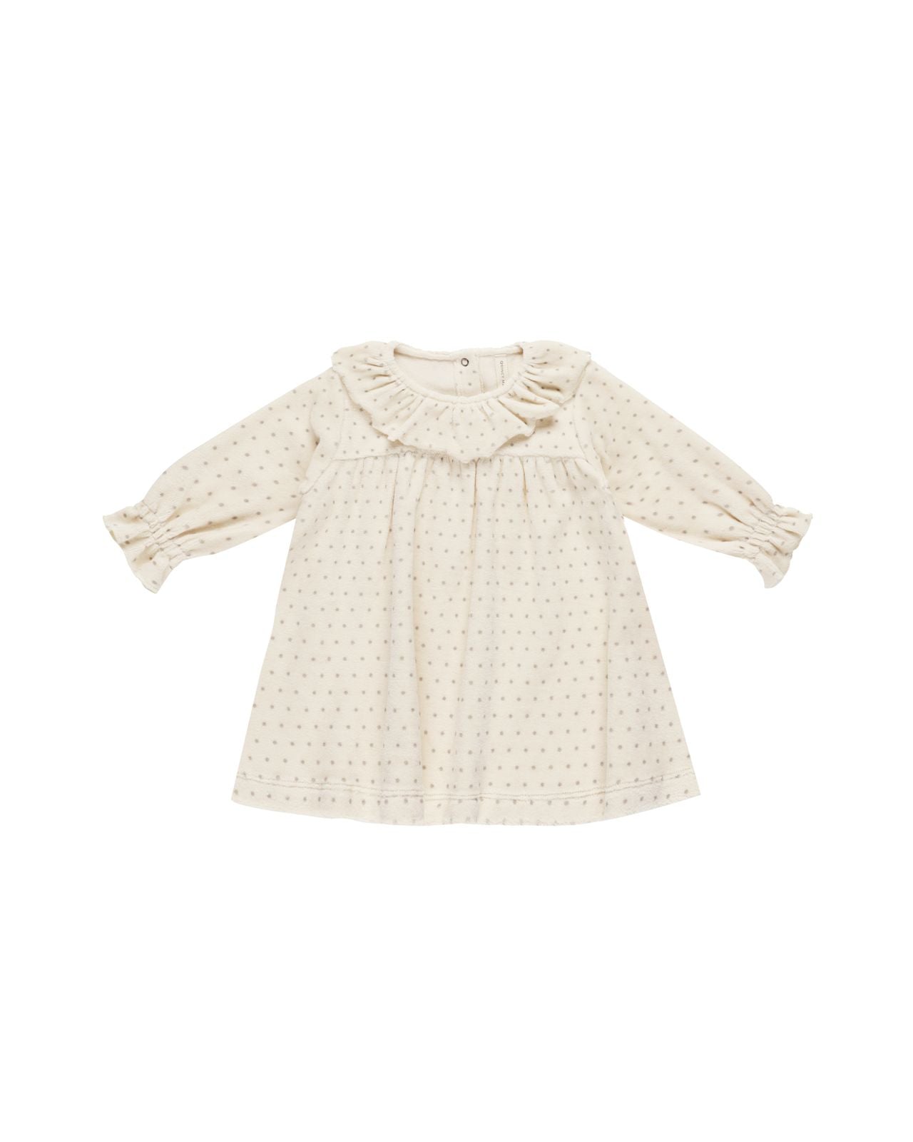 The Velour Baby Dress features an empire waist dress with long sleeves and a cute ruffled collar.
